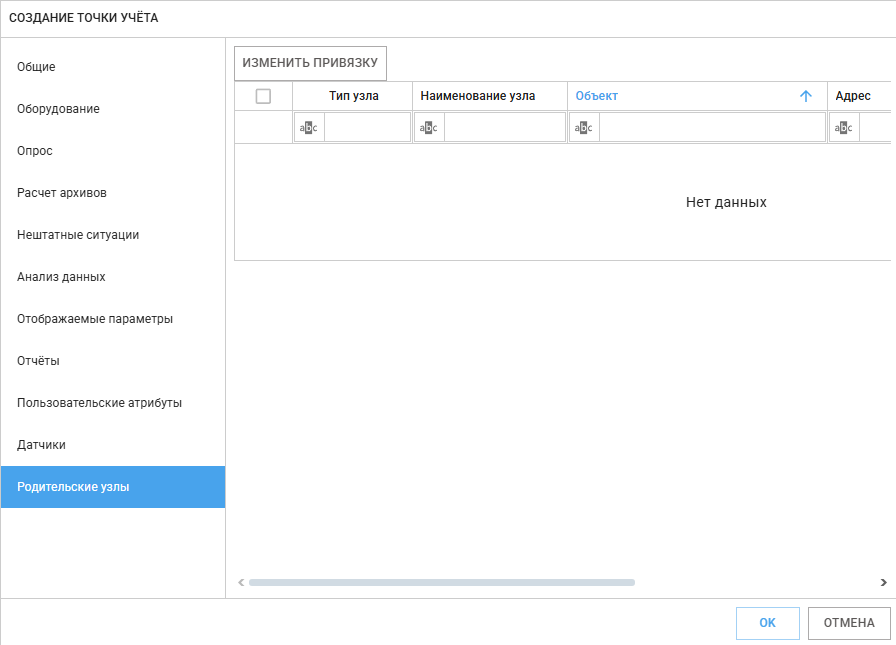 В данной вкладке выводятся родительские точки учета, если выбранная точка учета уже привязано кужа то в Редакторе дерева, изменить привязку или привязать создаваемую точку можно кнопкой Изменить привязку.