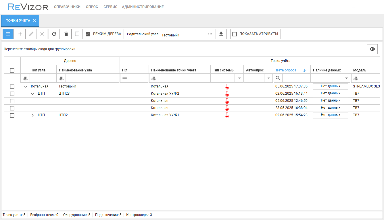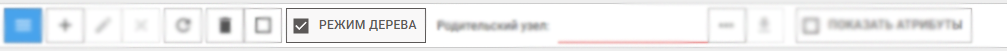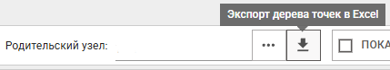Панель управления в Режиме дерева не отличается от панели управления справочника, за исключением того, что теперь они отвечают за создание/редактирование/удаление узлов дерева, а не точки учета, а также вместо Групп объектов появляется элемент выбора Родительских узлов для отображения в таблице, с возможностью экспорта дерева в формате xlsx.